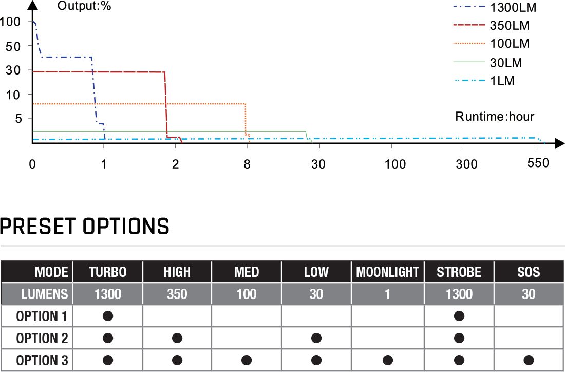 - Режими на осветяване: 7 режима на осветление, включително 5 нива на яркост, стробоскоп и SOS