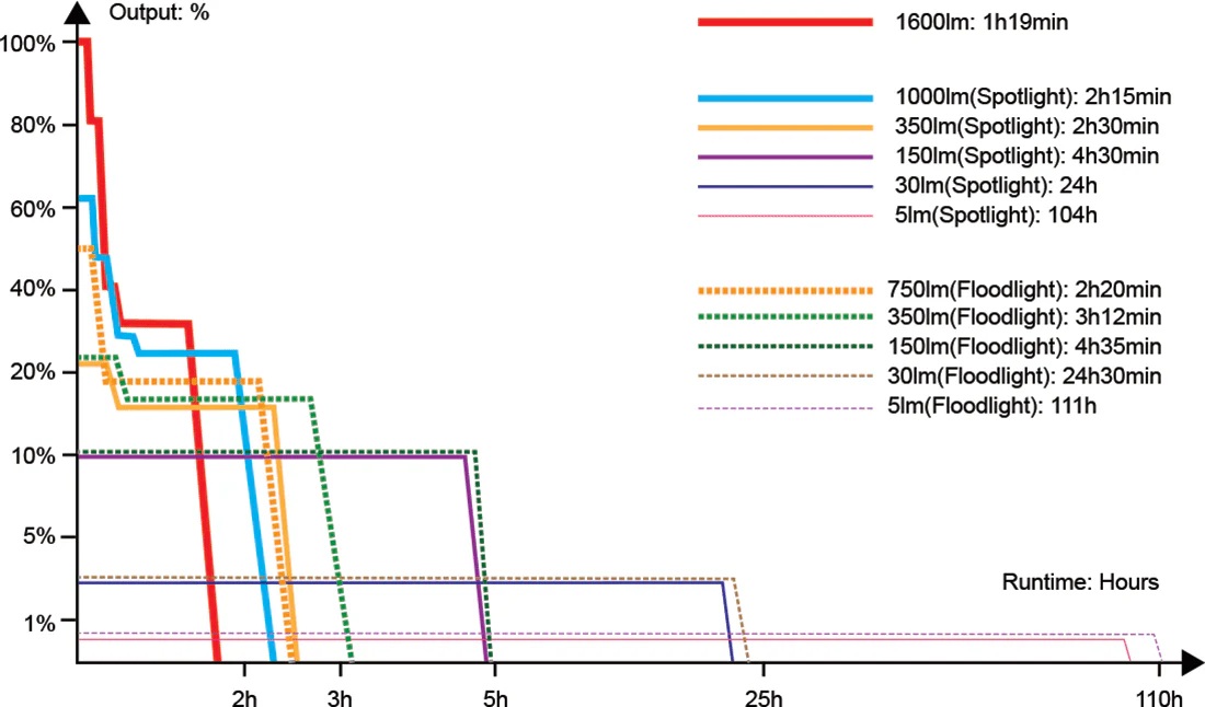 - Режими на осветяване: 12 режима на осветление, включително 5 нива на фокусиран лъч, 5 нива на широк лъч, Instant Turbo, Strobe, UV светлина, червен лазерен показалец и пет цветни режима на осветление на пръстена и опашката