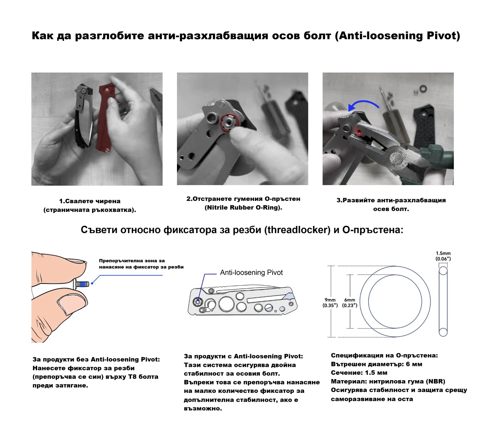 Това е специален компонент, проектиран да предотвратява разхлабването на оста на ножа при продължителна употреба. Болтът е демонтиращ се и може да бъде обслужван при нужда.