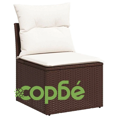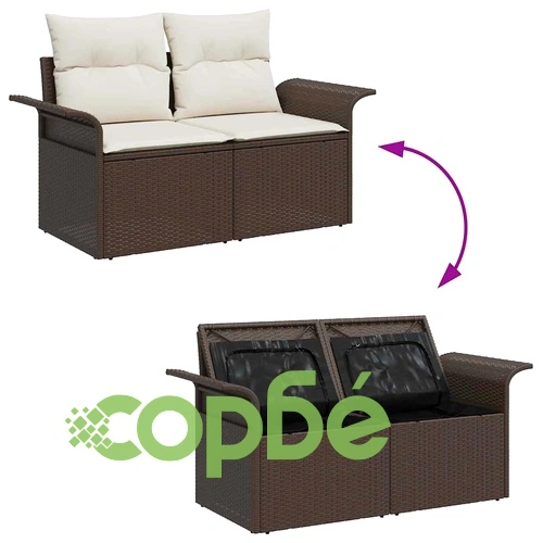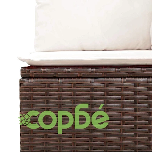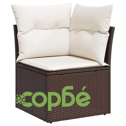 Включените възглавници от полиестер осигуряват изключителен комфорт 💺. Дебелите възглавници са специално проектирани за външна употреба и запазват формата си дори при продължително използване. Кремавобелият цвят на възглавниците създава красив контраст с кафявата рамка.