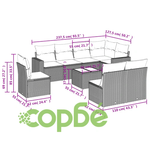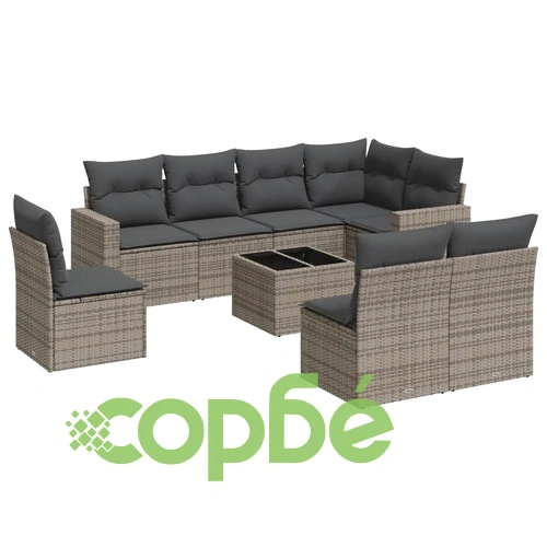 Градински комплект диван с възглавници 9 части сив полиратан – вземи за 1,022.00 лв. (522.54€)
