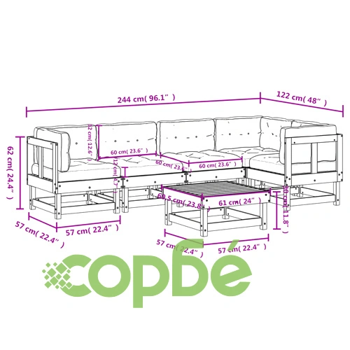 Този дървен градински лаундж комплект, който се отличава с дизайн на летви и меки възглавници, ще бъде чудесно допълнение към вашата градина, вътрешен двор или тераса, за да се насладите на уютно време със семейството или приятелите си. Масивна борова дървесина: Масивната борова дървесина е красив естествен материал. Боровата дървесина е с продълговати шарки, а чеповете придават на материала характерния му рустик вид.Здрава и стабилна рамка: Дървената рамка прави лаундж комплекта здрав и стабилен за ежедневна употреба на открито.Удобно седене: Облегалката и подлакътника добавят повече комфорт при седене на градинския комплект мебели. Освен това дебело подплатените възглавници осигуряват комфорт по време на седене.Модулен дизайн: Комплектът мебели е гъвкав и лесен за преместване. Можете да я комбинирате с други модулни сегменти в уеб магазина, за да създадете свои лични конфигурации на градински лаундж комплект! Добре е да се знае:За да сте сигурни, че вашите външни мебели ще останат красиви, ви препоръчваме да ги защитите с водоустойчиво покривало. Максимално 110 кг на седалка.