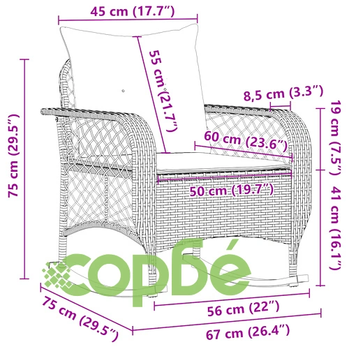 Отпуснете се и се насладете на живота на открито в този удобен градински люлеещ се стол! Издръжлив материал: PE ратан, известен също като полиратан, е здрав синтетичен материал с малко необходима поддръжка, който прилича на естествен ратан. Той е лек, лесен за почистване и често се използва за външни мебели поради своята издръжливост и устойчивост на атмосферни влияния.Успокояващо люлеене & стабилност: Леко люлеене напред-назад на тази градинска седалка за максимална релаксация. Долната част на металните крака на люлеещия се стол за открито е снабдена с гумена лента, която увеличава сцеплението и стабилността, като предотвратява преобръщането му по време на употреба.Удобна седалка: Тази мебел за открито, снабдена с плътно подплатени възглавници, предлага удобство при сядане.Калъф, който може да се сваля и може да се пере: Възглавницата на седалката разполага с калъф, който може да се сваля за лесно пране и поддръжка.Здрава и стабилна рамка: Стоманената рамка с прахово покритие гарантира, че градинската мебел е здрава и стабилна за ежедневна употреба на открито. Добре е да се знае:За да сте сигурни, че вашите външни мебели ще останат красиви, ви препоръчваме да ги защитите с водоустойчиво покривало.